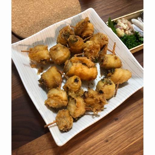 タチウオにシソと梅肉を巻いてからっと揚げます。