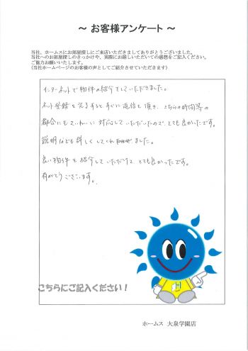 地域限定とペットの飼育が可能なお部屋ということで、たくさんのお部屋を比較するのは難しかったですが、条件の良いお部屋をご紹介できてよかったです♪